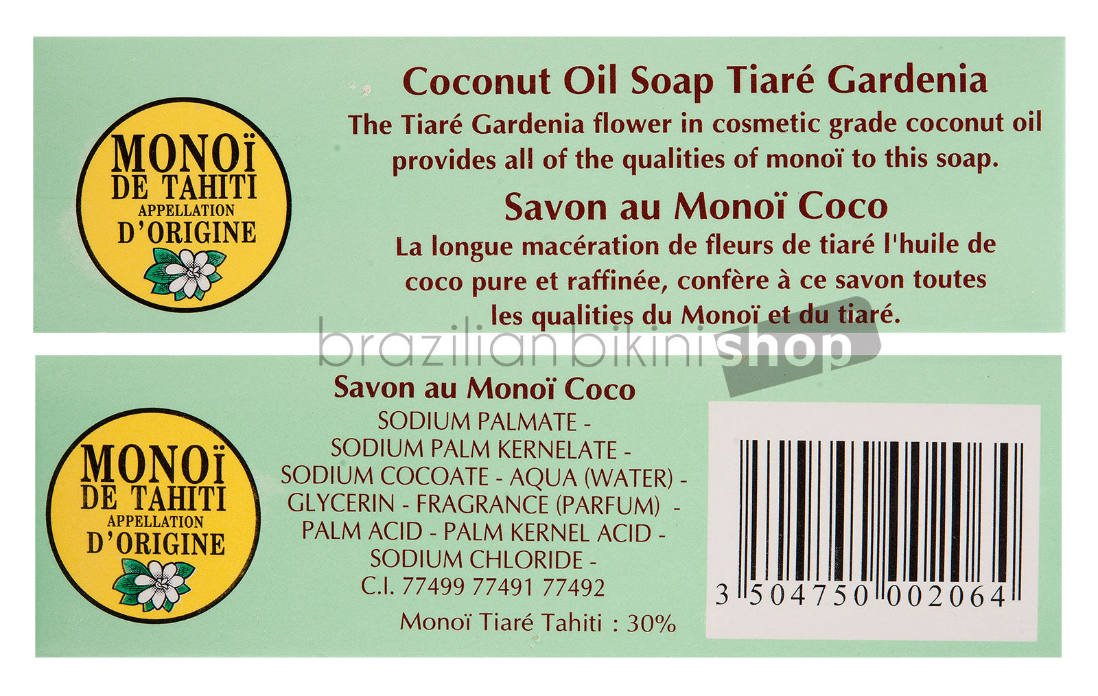 - Matière: 2% Monoï de Tahiti Appellation of Origin ECOCERT COSMOS. Sodium palmate, sodium palm kernelate, palm acid, palm kernel acid, aqua, glycerin, sodium chloride, Parfum, Cocos nucifera oil, gardenia tahitensis flower, tocopherol.