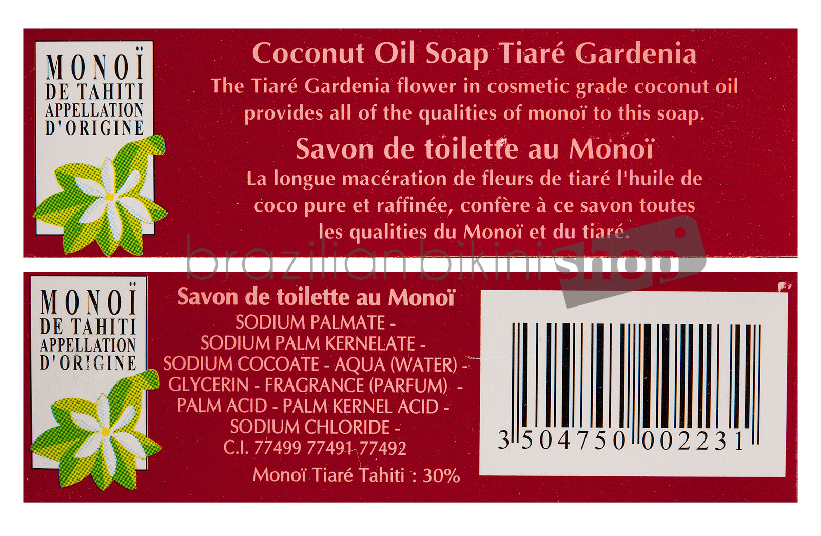 - Matière: Sodium palmate, Sodium palm kernelate, Palm acid, Palm kernel acid, Aqua, Glycerin, Sodium chloride, Cocos nucifera (coconut) oil, Gardenia Taitensis Flower Extract, Parfum (Fragrance), Tocopherol (Vitamin E).